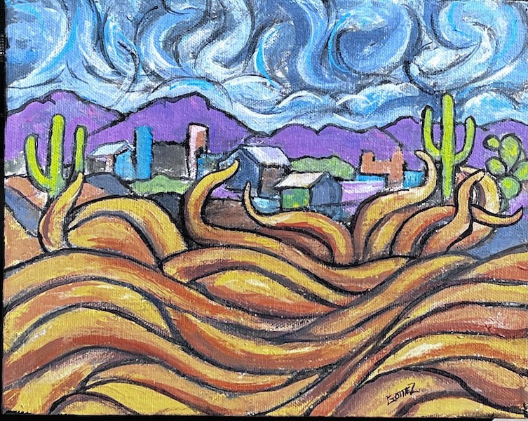 Santa Cruz River Flashflood Approaching Tucson. 2025. Acrylic on canvas. 8×10 inches. A scene in summer in Tucson, Arizona. Blue and gray sky, purple mountains, green saguaro, yellow ochre and brown tendrils of river water, outlined in black depicting the swirling river waters of the Santa Cruz River. The water is brown and moving rapidly, as it moves past the buildings, threatening desctruction during the monsoon season